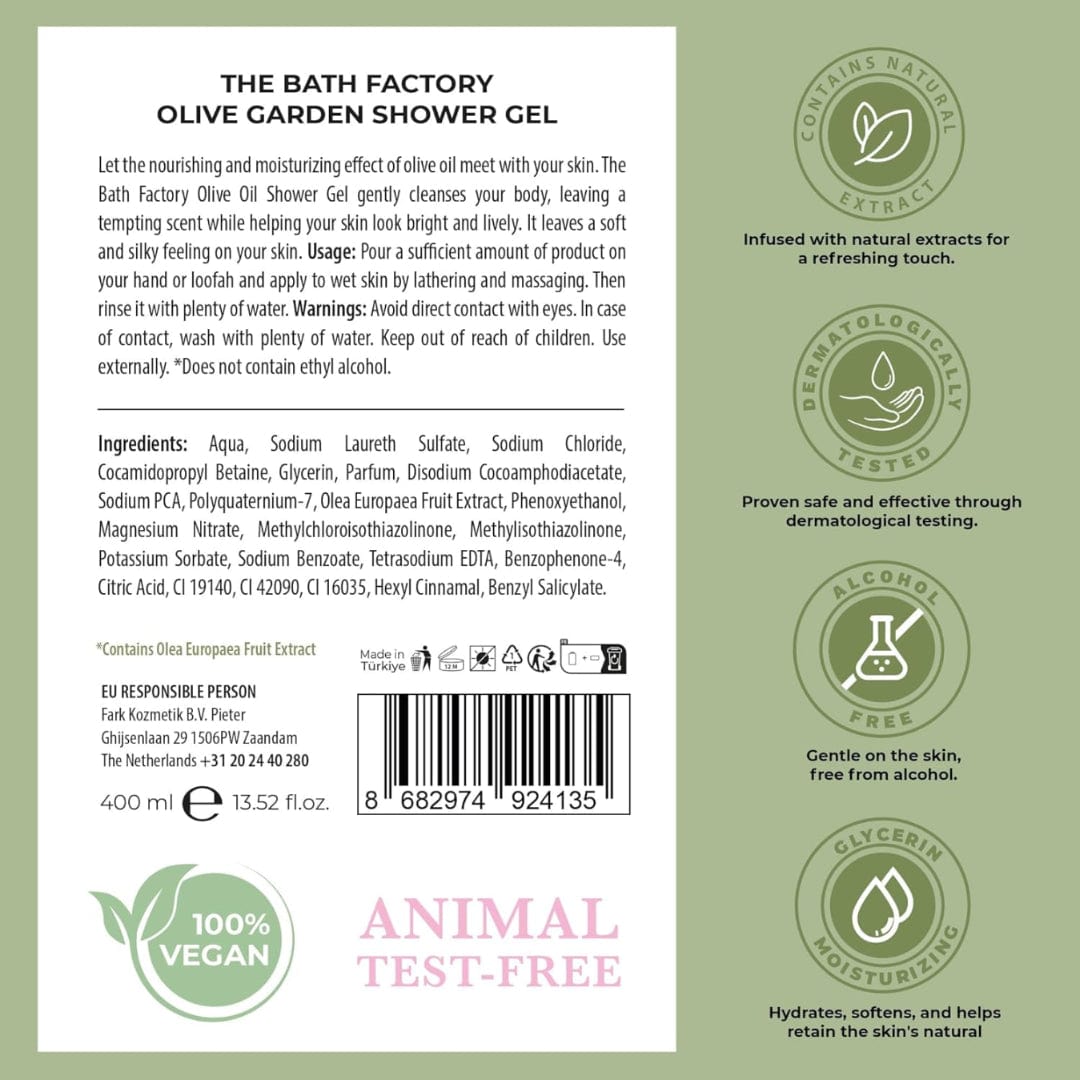 Dermatologically tested: Safe for all skin types, ensuring peace of mind for your daily skincare routine.Here is an SEO-friendly product listing for The Bath Factory Olive Garden Shower Gel, 400 ml