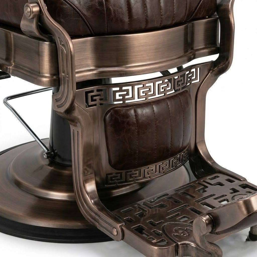 The GlobalStar 66-11 features a robust hydraulic system that allows smooth height adjustment, accommodating clients of all sizes with ease. The ornate bronze-finished metalwork, adorned with intricate Greek key patterns, adds a touch of classical elegance that sets your establishment apart. The fully adjustable and removable headrest ensures optimal positioning for haircuts, shaves, and styling services, while the reclining backrest provides versatility for various grooming procedures.