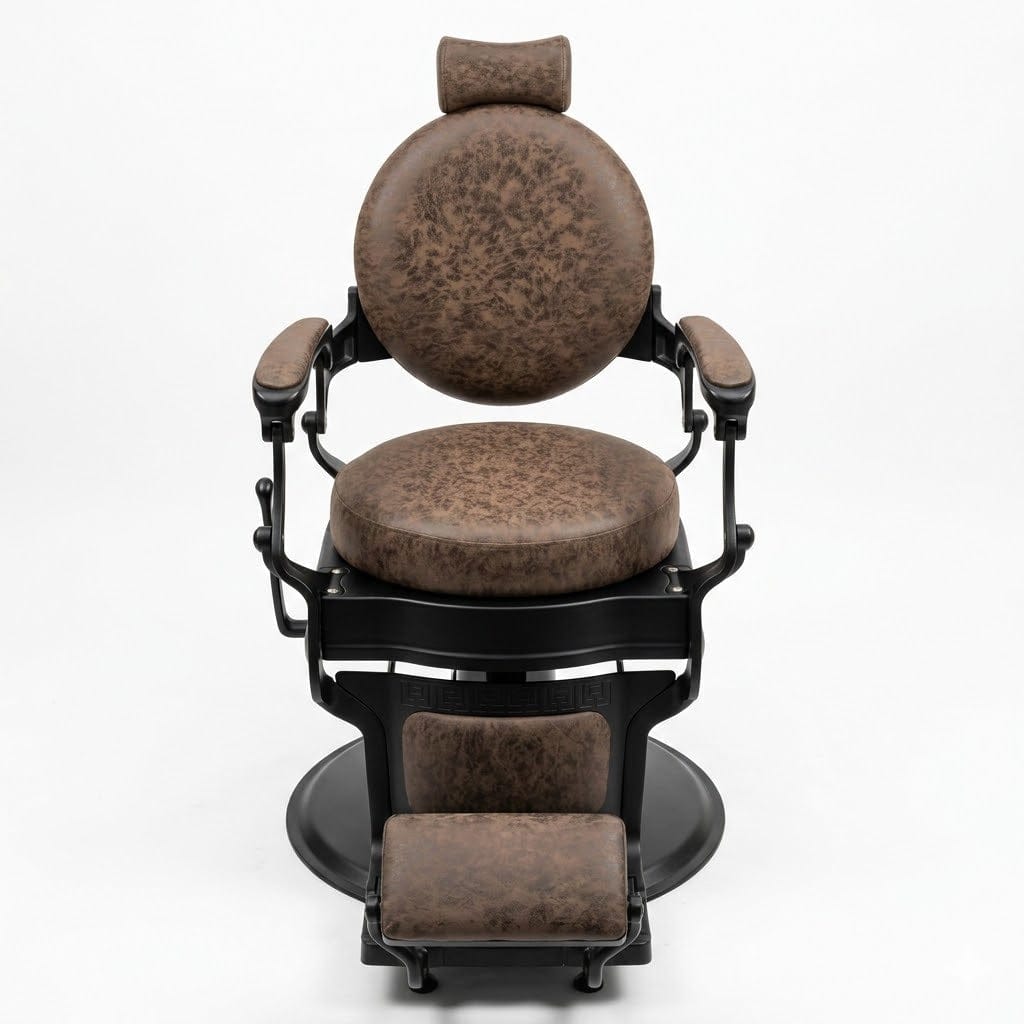 Premium brown leather with black frame delivers a luxury, high-contrast look that upgrades any barbershop interior.