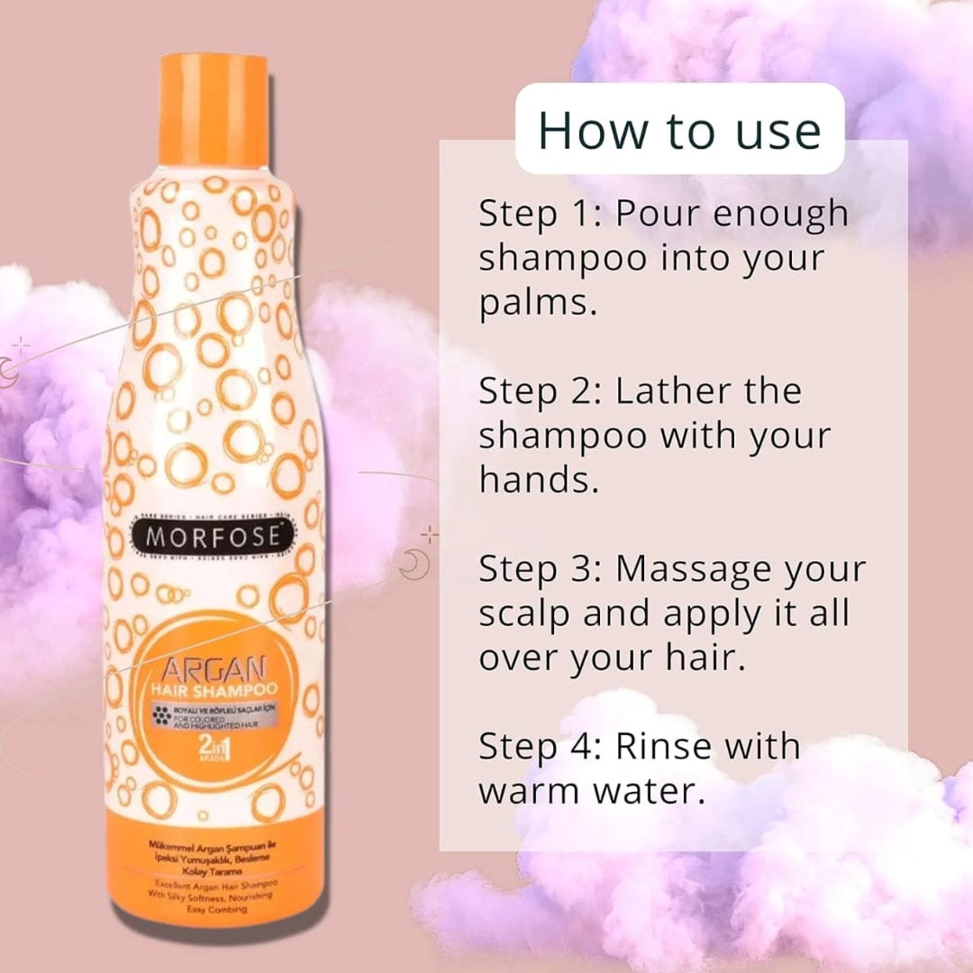 Morfose Argan Hair Shampoo (500ml): A rich, sulfate-free formula that gently cleanses while replenishing essential moisture. Enriched with Moroccan argan oil and vitamins, it helps strengthen hair, reduce frizz, and improve elasticity for healthier, shinier strands.