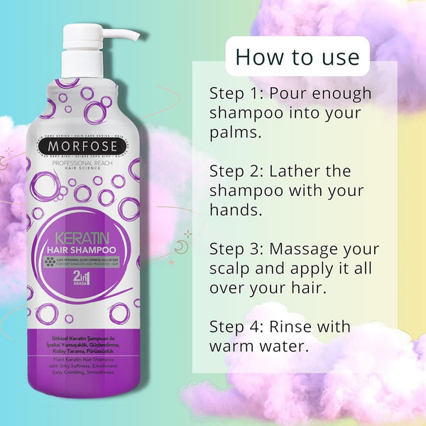 Discover Morfose Keratin Hair Shampoo 1000ml, a specialized formula designed to rejuvenate very damaged, weak, and brittle hair. Enriched with plant-derived keratin from wheat, corn, and soy, this shampoo gently cleanses while increasing moisture levels for improved manageability. Ideal for daily use, it nourishes hair strands, leaving them softer, stronger, and more resilient with every wash.