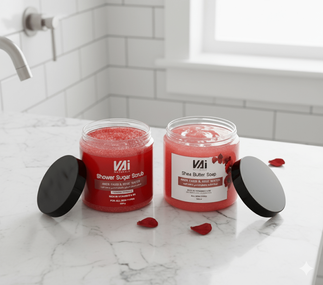 Vai Naturals Aker Fassi Skin Care Set – Foaming Sugar Scrub, Shea Butter Body Soap & Hydrating Body Butter