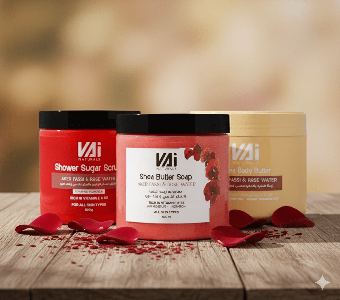 Vai Naturals Skin Care Trio with Aker Fassi – Exfoliating Scrub 600g, Moisturizing Soap 500ml & Rich Body Butter 300ml