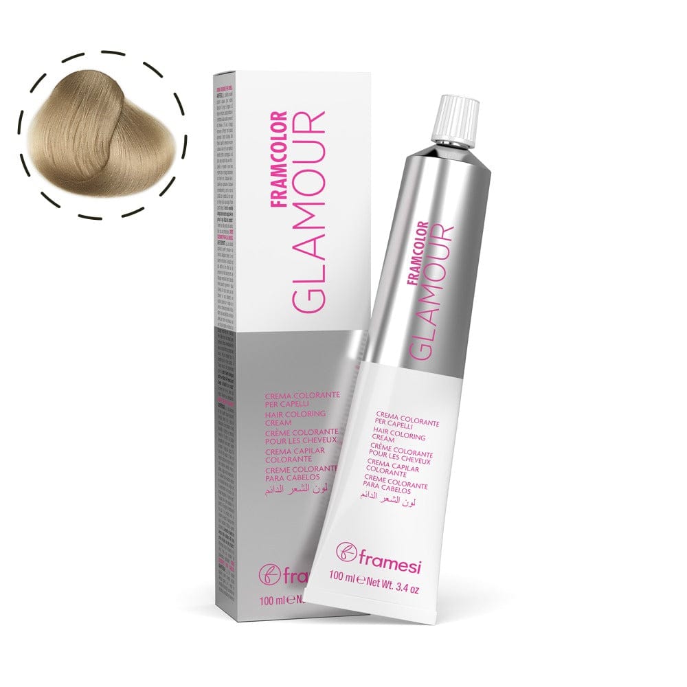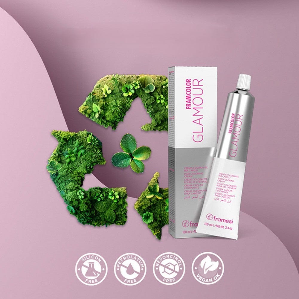 Formulated with Protective Coverage Technology, 18-MEA lipid, and low ammonia, FramColor Glamour provides 100% grey coverage from roots to ends without buildup or browning out over repeated applications. The Natural Ashes (.12) series combines pure ash (.1) with balanced green-blue undertones to control redness and brassiness, creating sophisticated, wearable cool tones that maintain clarity wash after wash.