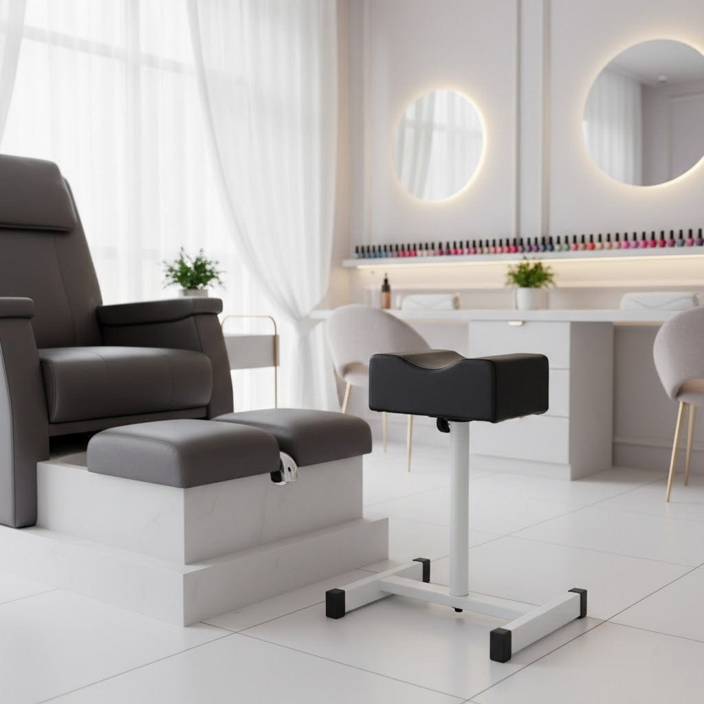 Built from durable metal and finished in white and chrome tones, this sturdy accessory adds a sleek, modern aesthetic to any salon environment. The eco-leather cushion in elegant black ensures a premium look and a soft, comfortable surface for clients’ legs and feet.