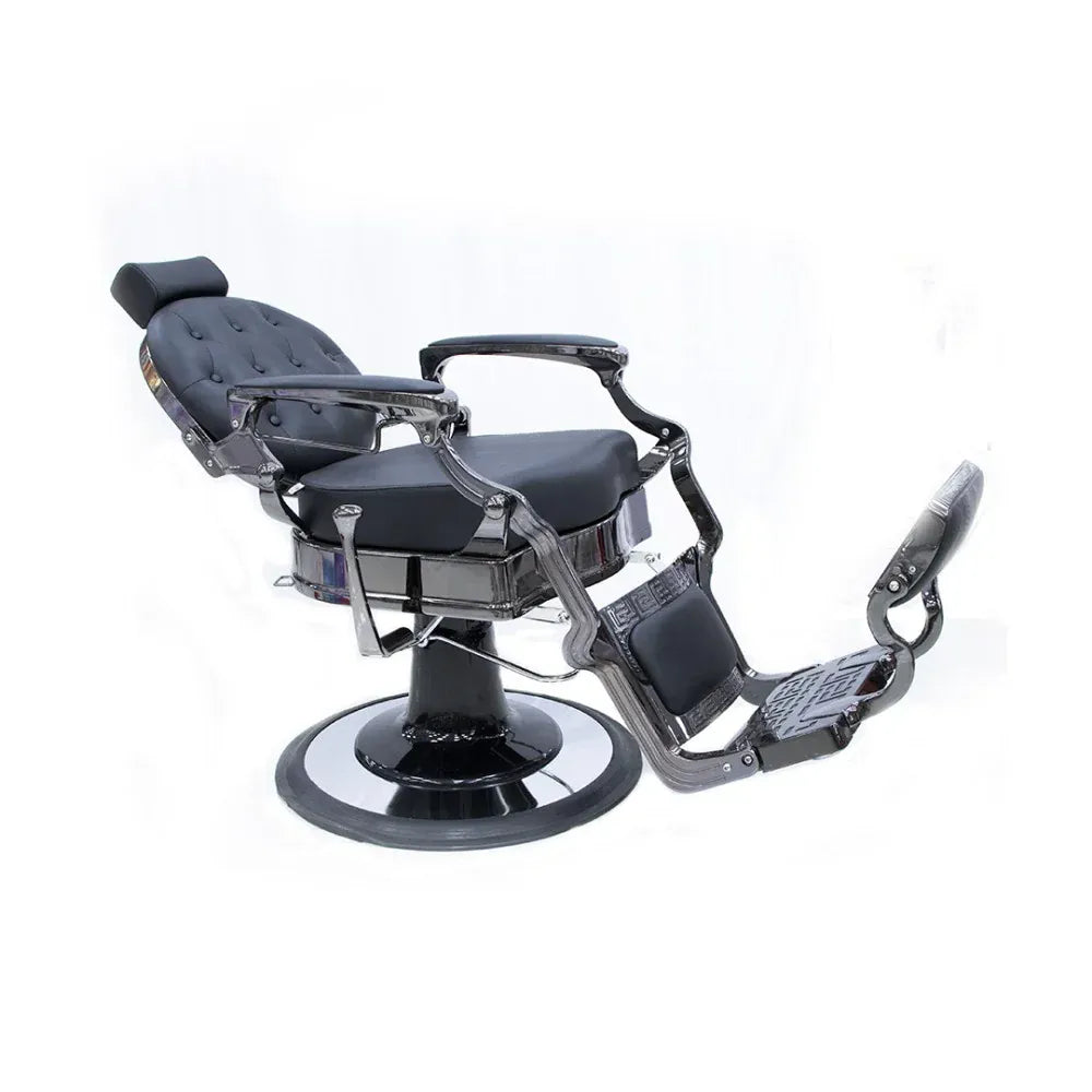 Glossy black leather with stainless steel creates a luxurious, high-end barbershop aesthetic.