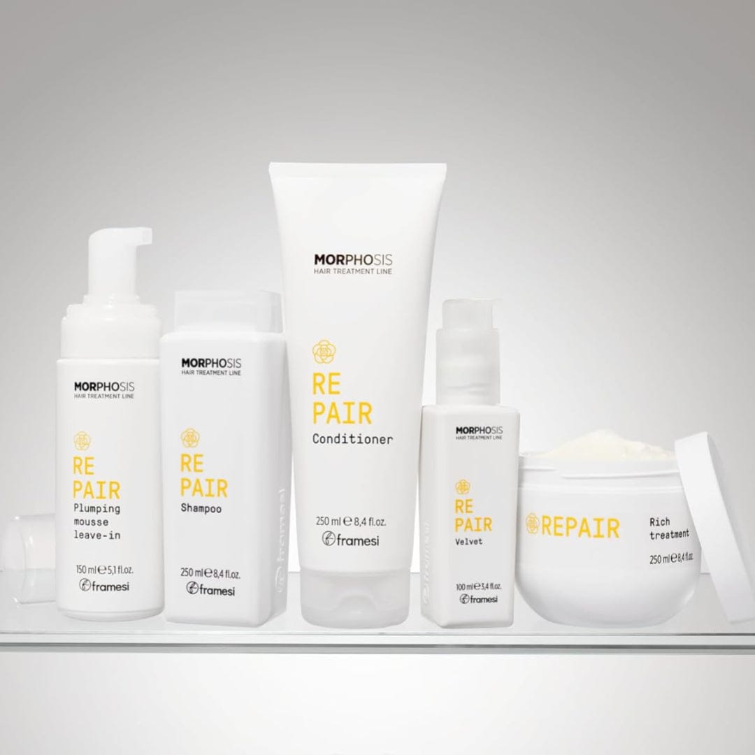 Introducing the FRAMESI Morphosis Repair Velvet Leave-In Conditioner, a revolutionary hair treatment that provides immediate reconstruction and improved manageability. Designed to envelop the hair in a protective layer of condition and shine, this leave-in conditioner is enriched with nourishing ingredients such as Camellia Oil, Hyaluronic Acid, Phyto-Ceramides, and Vegetable micro-Keratin. These powerful elements work together to fill porous hair, resulting in a smooth texture that adds body and eliminates frizz. With up to 98% natural ingredients, this conditioner is also color-safe, vegan, and free from gluten, parabens, and sulfates (SLS/SLES). Simply apply before styling—no rinsing necessary—for beautifully revitalized hair.