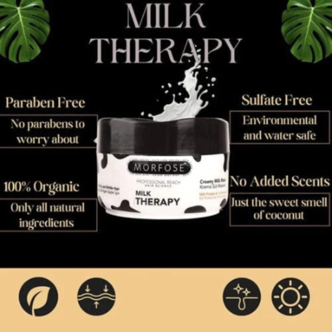 Indulge your hair in the nourishing power of milk protein with the Morfose Milk Therapy Hair Care Kit, a complete 3-step regimen designed to hydrate, repair, and protect. Enriched with milk protein and 12 essential amino acids, this professional-quality set restores natural shine, softness, and strength—perfect for dry, damaged, and chemically treated hair.