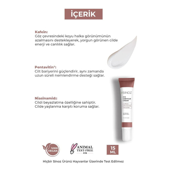 Sinoz Eye Contour Cream delivers targeted care for dark circles, puffiness, wrinkles, and sagging under the eyes. Formulated with Pentavitin, Caffeine, Vitamin B3 (niacinamide), and deeply hydrating actives, it diminishes the appearance of bruises, crow’s feet, and under-eye shadows by supporting the skin barrier from the outside. This multi-benefit cream provides daily intensive moisture, helping skin look bright and illuminated, while caffeine energizes and de-puffs tired eye areas for a refreshed, youthful effect.