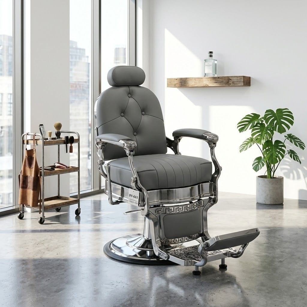 The Globalstar Grey Premium Barber Chair elevates any professional barbershop or luxury men's salon with its sophisticated grey finish and advanced functionality. Designed for both comfort and efficiency, this high-end chair features smooth 360° rotation for effortless stylist access and a fully reclining backrest that accommodates various grooming positions, from classic haircuts to relaxing shaves.