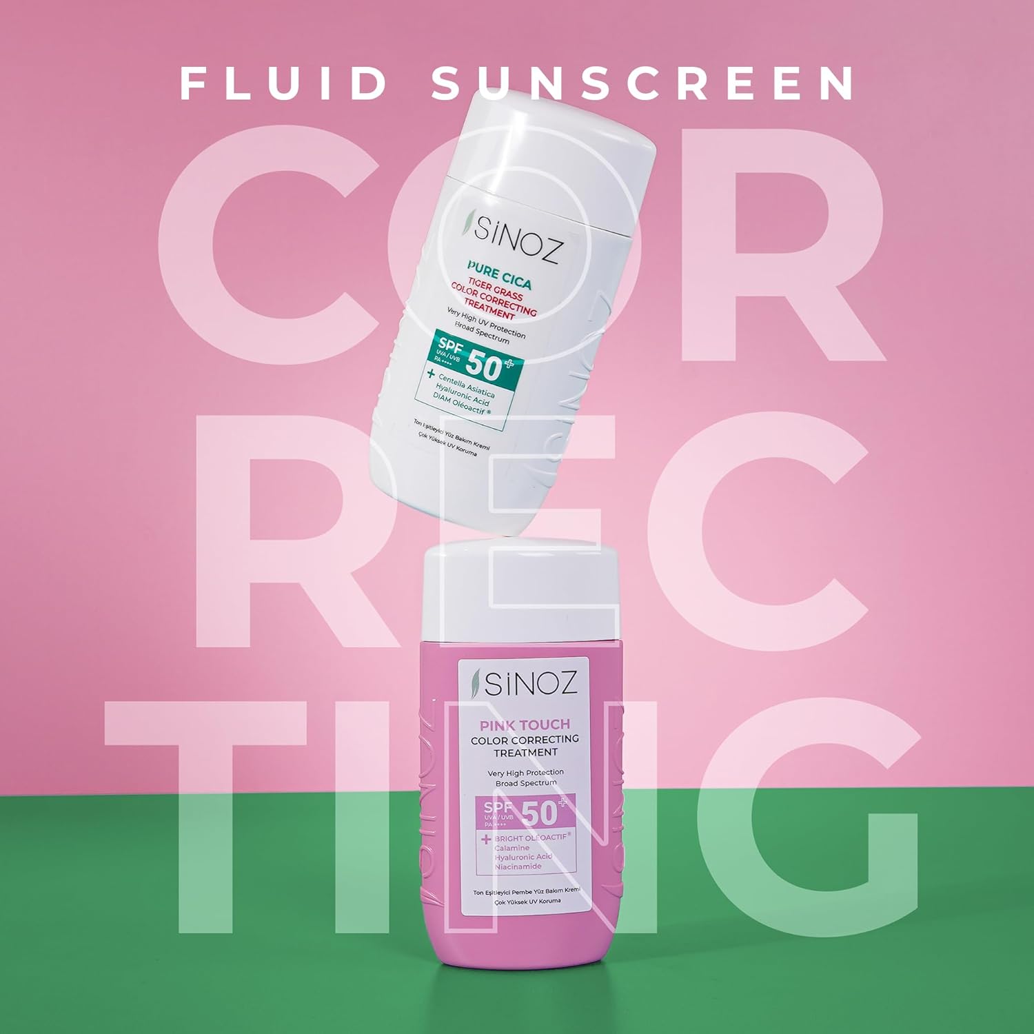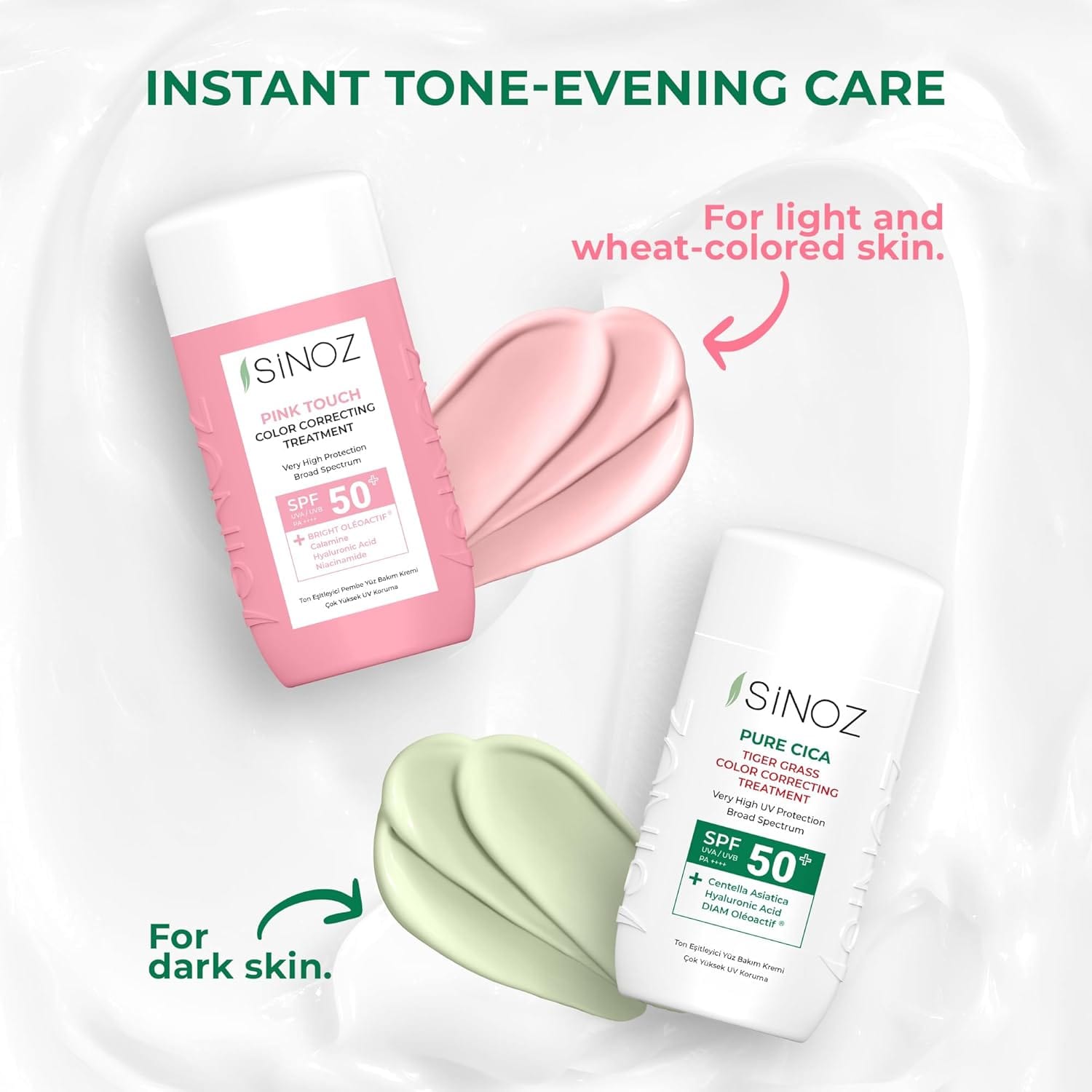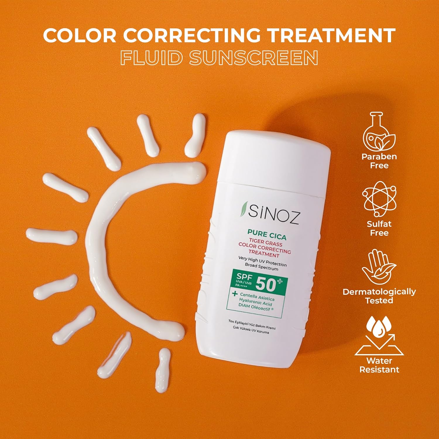 SINOZ Pure Cica Tiger Grass Correcting Treatment SPF50+ PA++++ is an innovative color-correcting cream that provides high-level sun protection while instantly neutralizing redness and evening skin tone. Powered by a blend of Centella Asiatica (Tiger Grass), Hyaluronic Acid, and DIAM Oleoactif, this multitasking formula visibly soothes irritated skin, repairs skin barrier function, and delivers deep, long-lasting moisturization for a renewed, supple complexion.
